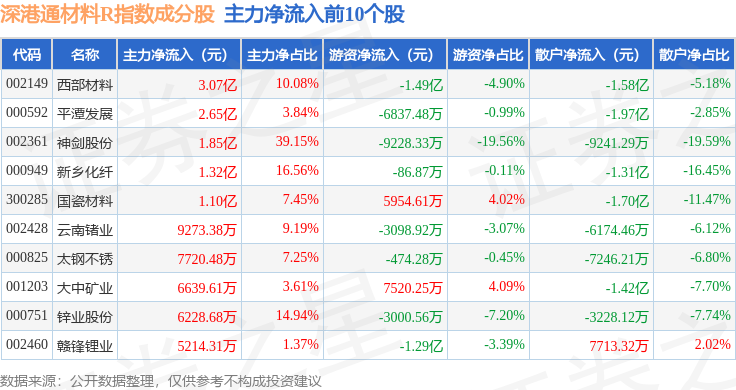 资金流向方面,深港通材料R(483015)指数成份股当日主力资金净流出合计24.15亿元,游资资金净流出合计4231.15万元,散户资金净流入合计24.57亿元。成份股资金流向详情见下表: