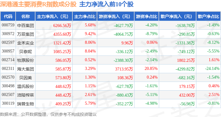 资金流向方面,深港通主要消费R(483021)指数成份股当日主力资金净流出合计10.79亿元,游资资金净流出合计4418.07万元,散户资金净流入合计11.23亿元。成份股资金流向详情见下表: