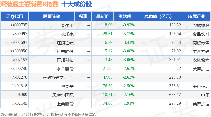 深港通主要消费R(483021)指数十大成份股详情如下:
