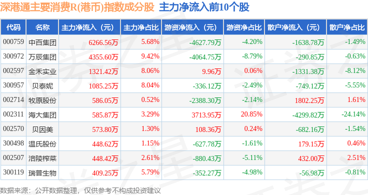 资金流向方面,深港通主要消费R(港币)(483022)指数成份股当日主力资金净流出合计10.79亿元,游资资金净流出合计4418.07万元,散户资金净流入合计11.23亿元。成份股资金流向详情见下表: