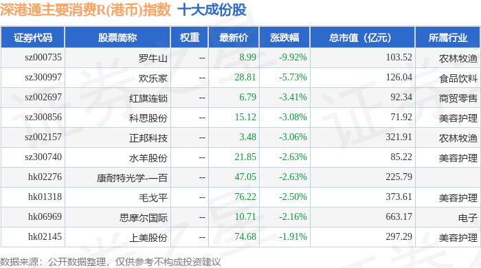 深港通主要消费R(港币)(483022)指数十大成份股详情如下: