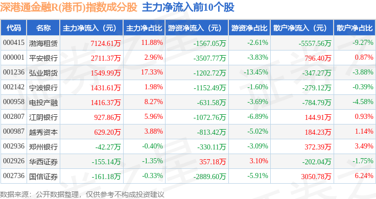 资金流向方面,深港通金融R(港币)(483026)指数成份股当日主力资金净流出合计9.62亿元,游资资金净流入合计1.67亿元,散户资金净流入合计7.95亿元。成份股资金流向详情见下表: