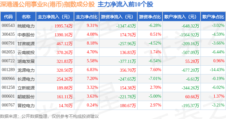 资金流向方面,深港通公用事业R(港币)(483032)指数成份股当日主力资金净流出合计1.86亿元,游资资金净流入合计4865.4万元,散户资金净流入合计1.38亿元。成份股资金流向详情见下表: