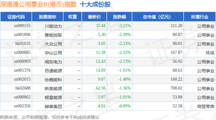 深港通公用事业R(港币)(483032)指数十大成份股详情如下: