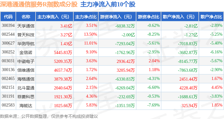 资金流向方面,深港通通信服务R(483033)指数成份股当日主力资金净流出合计20.24亿元,游资资金净流入合计5.19亿元,散户资金净流入合计15.05亿元。成份股资金流向详情见下表: