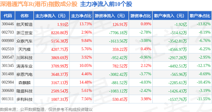 资金流向方面,深港通汽车R(港币)(483040)指数成份股当日主力资金净流出合计9.87亿元,游资资金净流出合计3892.52万元,散户资金净流入合计10.26亿元。成份股资金流向详情见下表: