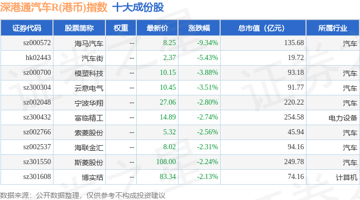 深港通汽车R(港币)(483040)指数十大成份股详情如下:
