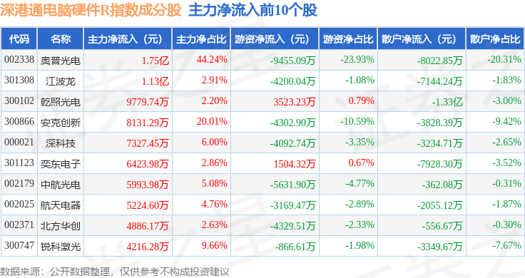 资金流向方面,深港通电脑硬件R(483043)指数成份股当日主力资金净流出合计65.26亿元,游资资金净流入合计15.35亿元,散户资金净流入合计49.92亿元。成份股资金流向详情见下表: