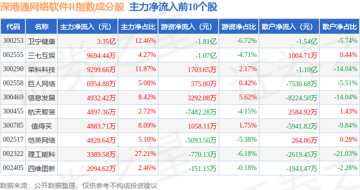 资金流向方面,深港通网络软件R(483047)指数成份股当日主力资金净流出合计17.85亿元,游资资金净流出合计79.79万元,散户资金净流入合计17.86亿元。成份股资金流向详情见下表: