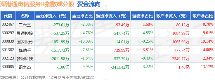资金流向方面,深港通电信服务R(483057)指数成份股当日主力资金净流出合计1.59亿元,游资资金净流出合计3579.46万元,散户资金净流入合计1.95亿元。成份股资金流向详情见下表: