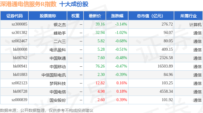 深港通电信服务R(483057)指数十大成份股详情如下: