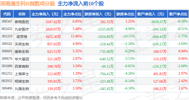 资金流向方面,深港通生科R(483059)指数成份股当日主力资金净流出合计5779.31万元,游资资金净流出合计8390.15万元,散户资金净流入合计1.42亿元。成份股资金流向详情见下表: