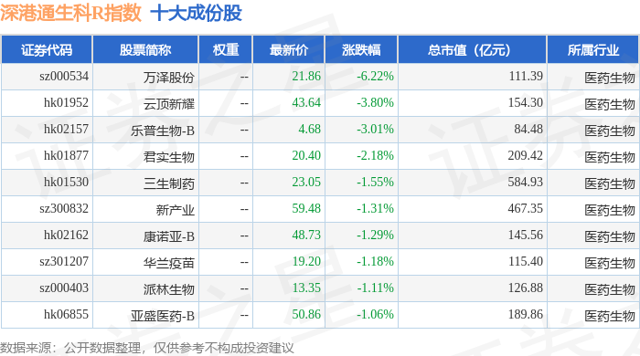 证券之星消息,12月18日,深港通生科R(483059)指数报收于7424.04点,跌0.11%,成交88.18亿元,换手率0.62%。当日该指数成份股中,上涨的有32家,再鼎医药以2.45%的涨幅领涨,下跌的有26家,万泽股份以6.22%的跌幅领跌。