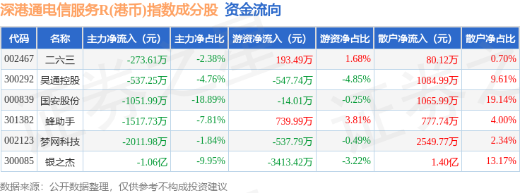 资金流向方面,深港通电信服务R(港币)(483058)指数成份股当日主力资金净流出合计1.59亿元,游资资金净流出合计3579.46万元,散户资金净流入合计1.95亿元。成份股资金流向详情见下表: