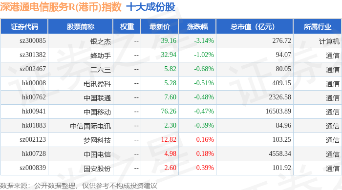 深港通电信服务R(港币)(483058)指数十大成份股详情如下: