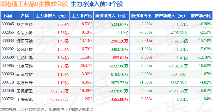 资金流向方面,深港通工业品R(483069)指数成份股当日主力资金净流出合计63.57亿元,游资资金净流入合计8.73亿元,散户资金净流入合计54.84亿元。成份股资金流向详情见下表: