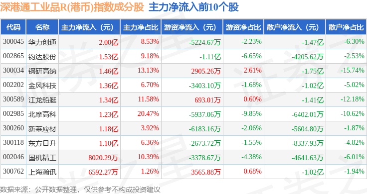 资金流向方面,深港通工业品R(港币)(483070)指数成份股当日主力资金净流出合计63.57亿元,游资资金净流入合计8.73亿元,散户资金净流入合计54.84亿元。成份股资金流向详情见下表:
