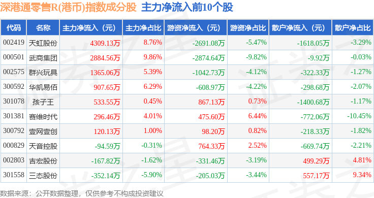 资金流向方面,深港通零售R(港币)(483074)指数成份股当日主力资金净流出合计922.72万元,游资资金净流出合计1.03亿元,散户资金净流入合计1.12亿元。成份股资金流向详情见下表: