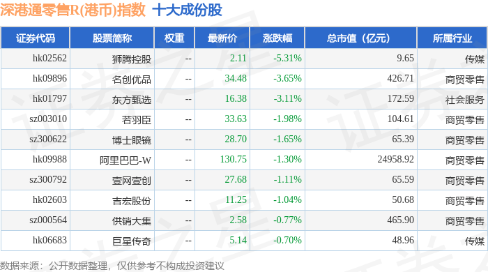 深港通零售R(港币)(483074)指数十大成份股详情如下:
