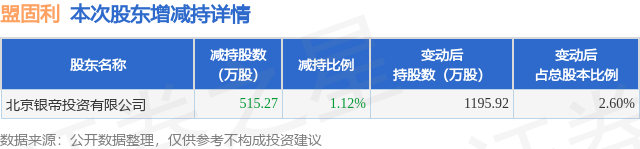 证券之星消息,12月18日盟固利发布公告《盟固利:关于持股5%以上股东减持股份触及1%整数倍的公告》,其股东北京银帝投资有限公司于2025年11月28日至2025年12月17日间合计减持515.27万股,占公司目前总股本的1.1211%,变动期间该股股价下跌9.97%,截止12月17日收盘报21.21元。