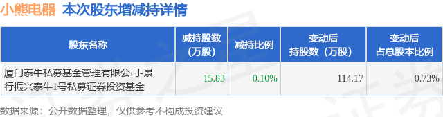 证券之星消息,12月18日小熊电器发布公告《小熊电器:关于公司股东减持计划期限届满暨实施结果的公告》,其股东厦门泰牛私募基金管理有限公司-景行振兴泰牛1号私募证券投资基金于2025年10月30日合计减持15.83万股,占公司目前总股本的0.1006%,变动期间该股股价下跌2.02%,截止10月30日收盘报48.48元。