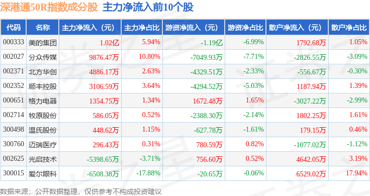 资金流向方面,深港通50R(483091)指数成份股当日主力资金净流出合计60.63亿元,游资资金净流入合计22.29亿元,散户资金净流入合计38.35亿元。成份股资金流向详情见下表: