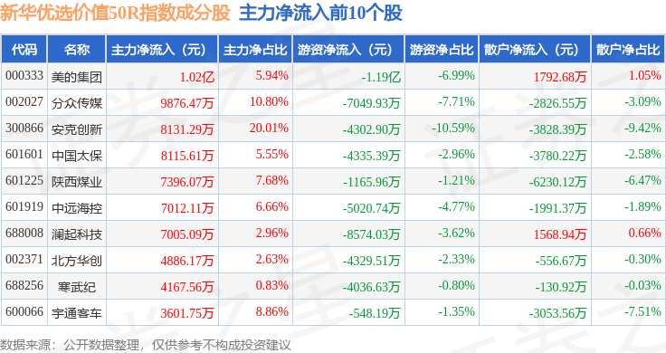 资金流向方面,新华优选价值50R(489004)指数成份股当日主力资金净流出合计91.83亿元,游资资金净流入合计32.07亿元,散户资金净流入合计59.76亿元。成份股资金流向详情见下表: