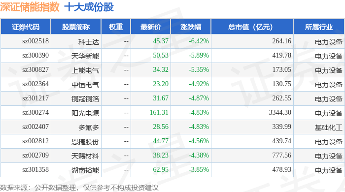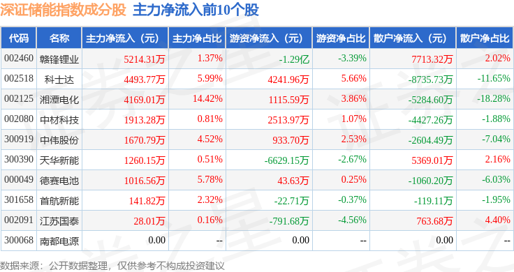 资金流向方面,深证储能(970036)指数成份股当日主力资金净流出合计54.74亿元,游资资金净流入合计9.02亿元,散户资金净流入合计45.71亿元。成份股资金流向详情见下表: