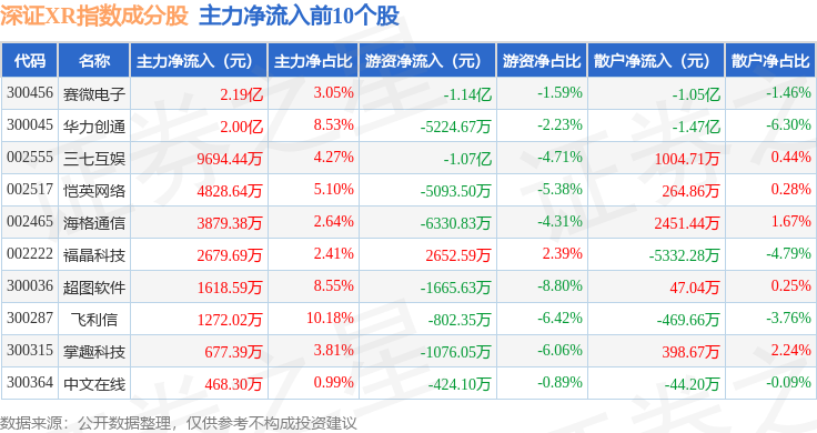 资金流向方面,深证XR(970046)指数成份股当日主力资金净流出合计29.36亿元,游资资金净流入合计6.27亿元,散户资金净流入合计23.08亿元。成份股资金流向详情见下表: