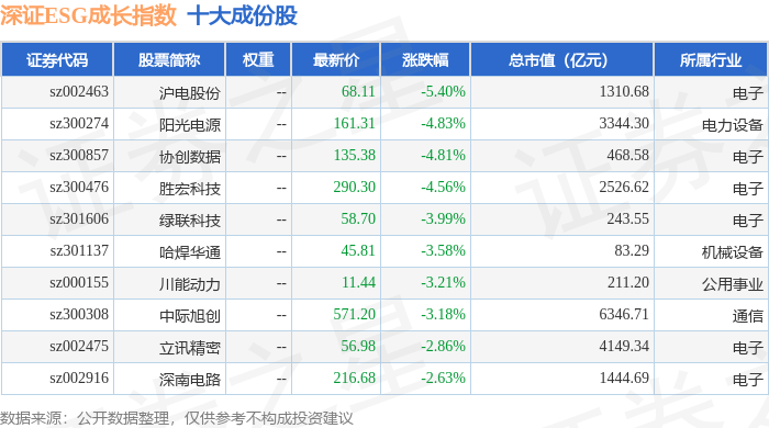 证券之星消息,12月18日,深证ESG成长(970060)指数报收于2238.77点,跌2.15%,成交836.5亿元,换手率2.03%。当日该指数成份股中,上涨的有12家,浙江世宝以10.02%的涨幅领涨,下跌的有37家,沪电股份以5.4%的跌幅领跌。