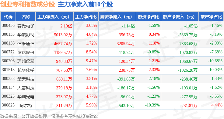 资金流向方面,创业专利(970068)指数成份股当日主力资金净流出合计34.8亿元,游资资金净流入合计8.1亿元,散户资金净流入合计26.71亿元。成份股资金流向详情见下表: