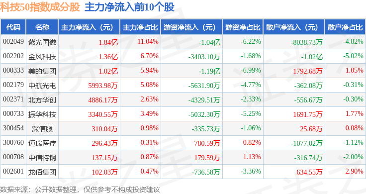 资金流向方面,科技50(970080)指数成份股当日主力资金净流出合计63.57亿元,游资资金净流入合计14.26亿元,散户资金净流入合计49.31亿元。成份股资金流向详情见下表: