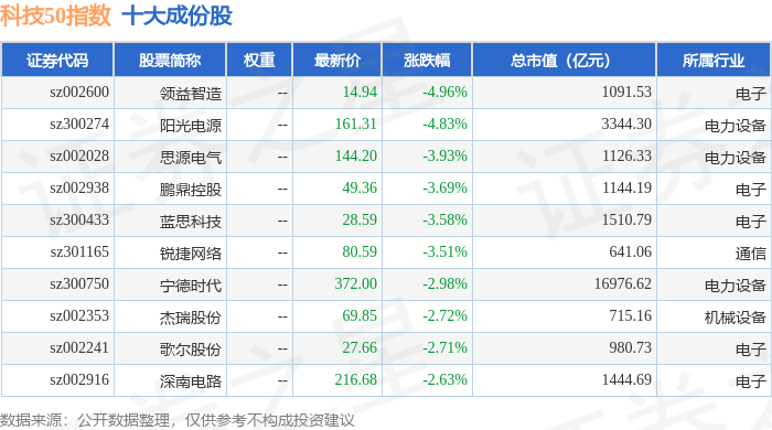 证券之星消息,12月18日,科技50(970080)指数报收于3081.83点,跌1.67%,成交789.81亿元,换手率1.22%。当日该指数成份股中,上涨的有9家,振华科技以2.32%的涨幅领涨,下跌的有39家,领益智造以4.96%的跌幅领跌。