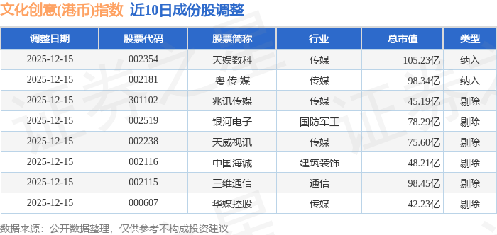 近10日内文化创意(港币)(980047)指数成份股做了调整,新纳入了2只股票,剔除了6只股票。
