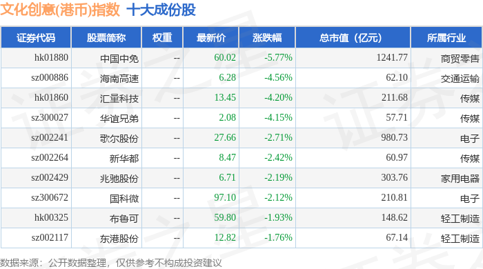 文化创意(港币)(980047)指数十大成份股详情如下: