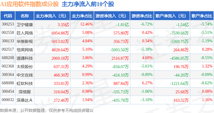 资金流向方面,AI应用软件(980107)指数成份股当日主力资金净流出合计8.3亿元,游资资金净流入合计1.07亿元,散户资金净流入合计7.23亿元。成份股资金流向详情见下表: