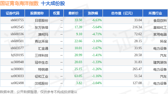 国证青岛海洋(980532)指数十大成份股详情如下: