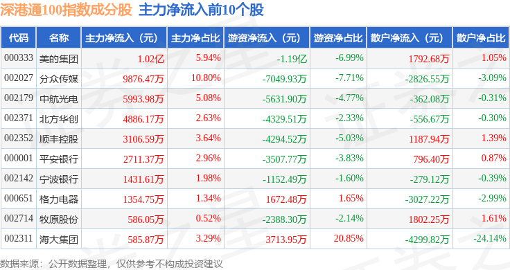 资金流向方面,深港通100(983007)指数成份股当日主力资金净流出合计80.41亿元,游资资金净流入合计29.64亿元,散户资金净流入合计50.78亿元。成份股资金流向详情见下表: