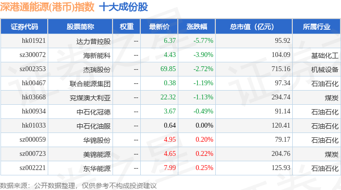 深港通能源(港币)(983014)指数十大成份股详情如下: