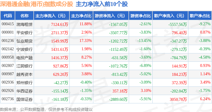 资金流向方面,深港通金融(港币)(983026)指数成份股当日主力资金净流出合计9.62亿元,游资资金净流入合计1.67亿元,散户资金净流入合计7.95亿元。成份股资金流向详情见下表: