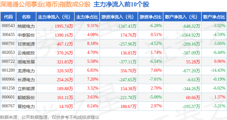资金流向方面,深港通公用事业(港币)(983032)指数成份股当日主力资金净流出合计1.86亿元,游资资金净流入合计4865.4万元,散户资金净流入合计1.38亿元。成份股资金流向详情见下表: