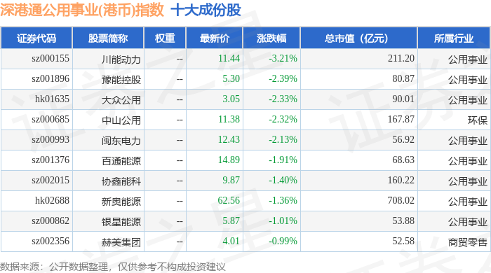 深港通公用事业(港币)(983032)指数十大成份股详情如下: