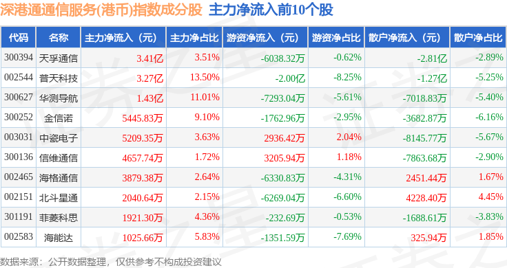 资金流向方面,深港通通信服务(港币)(983034)指数成份股当日主力资金净流出合计20.24亿元,游资资金净流入合计5.19亿元,散户资金净流入合计15.05亿元。成份股资金流向详情见下表: