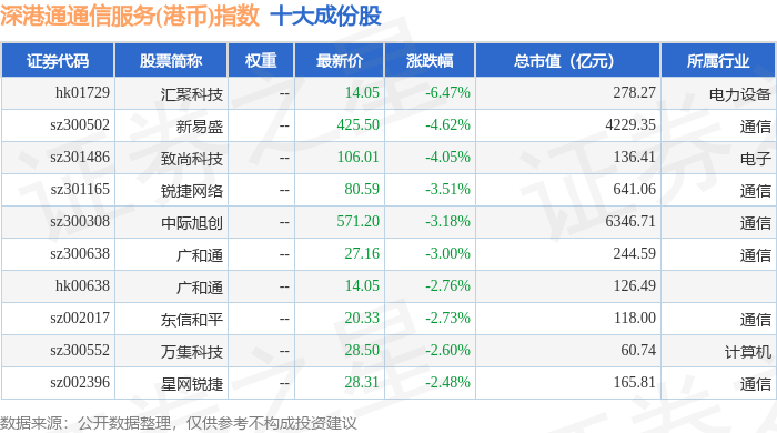 深港通通信服务(港币)(983034)指数十大成份股详情如下: