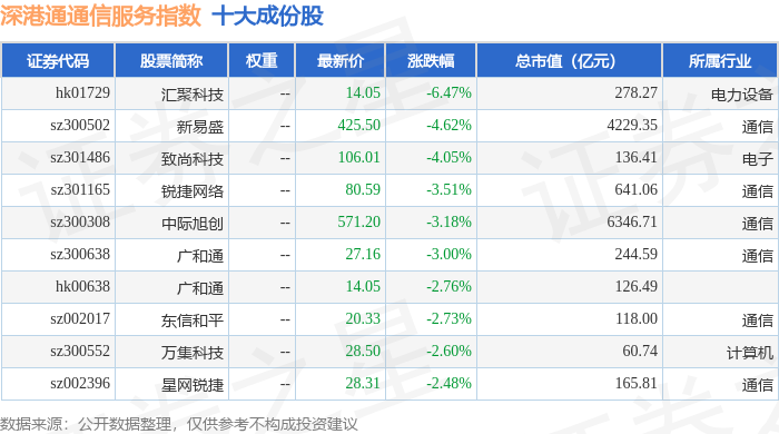 证券之星消息,12月18日,深港通通信服务(983033)指数报收于12355.0点,跌1.71%,成交1005.8亿元,换手率3.4%。当日该指数成份股中,上涨的有28家,普天科技以6.38%的涨幅领涨,下跌的有33家,汇聚科技以6.47%的跌幅领跌。