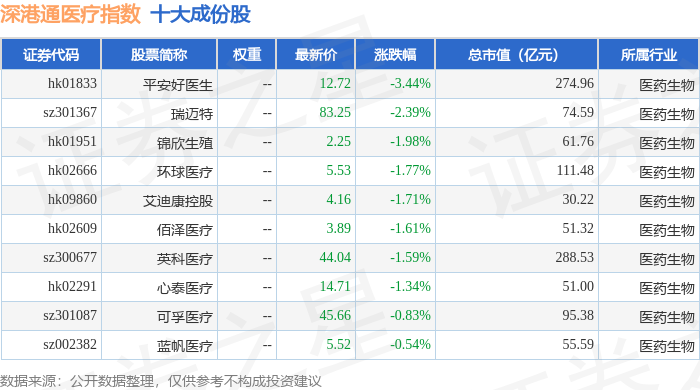 证券之星消息,12月18日,深港通医疗(983035)指数报收于4465.35点,涨1.2%,成交121.75亿元,换手率1.72%。当日该指数成份股中,上涨的有42家,美年健康以10.05%的涨幅领涨,下跌的有16家,平安好医生以3.44%的跌幅领跌。
