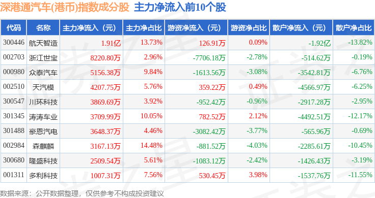 资金流向方面,深港通汽车(港币)(983040)指数成份股当日主力资金净流出合计9.87亿元,游资资金净流出合计3892.52万元,散户资金净流入合计10.26亿元。成份股资金流向详情见下表: