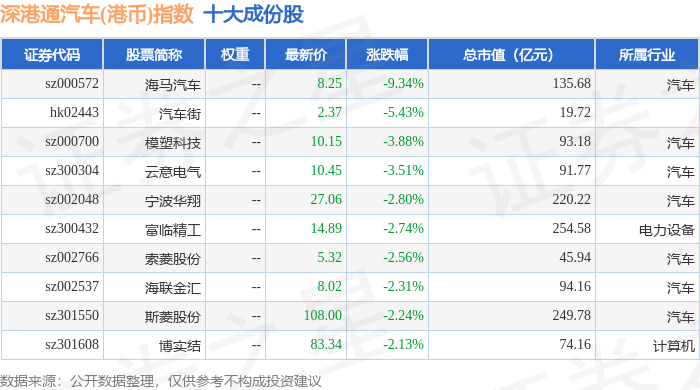 深港通汽车(港币)(983040)指数十大成份股详情如下: