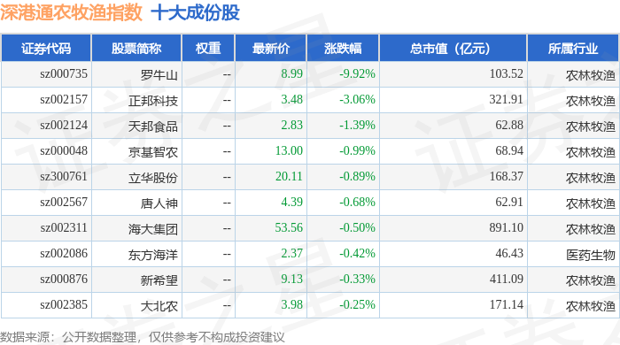 深港通农牧渔(983051)指数十大成份股详情如下: