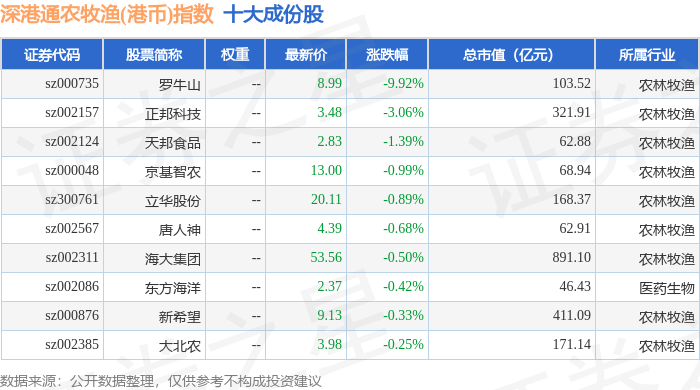 深港通农牧渔(港币)(983052)指数十大成份股详情如下: